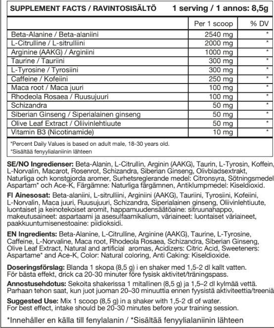 - Beta-Alanin (2540 mg): Øker karnosin-nivåene i musklene for bedre utholdenhet og redusert melkesyreoppbygging under intense treningsøkter.